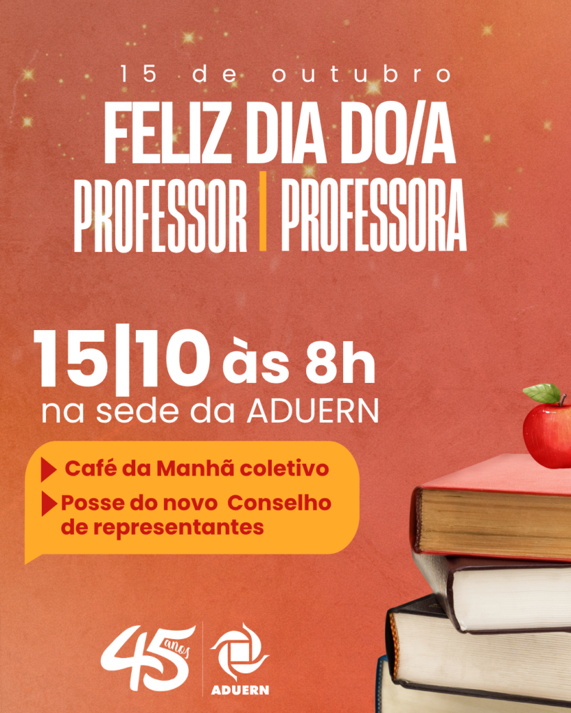 A ADUERN realizará, nesta quarta-feira (15), um café da manhã especial em homenagem ao Dia do Professor e da Professora, a partir das 8h, na sede da entidade. Durante o encontro, será realizada também a posse de parte do novo Conselho de Representantes.
