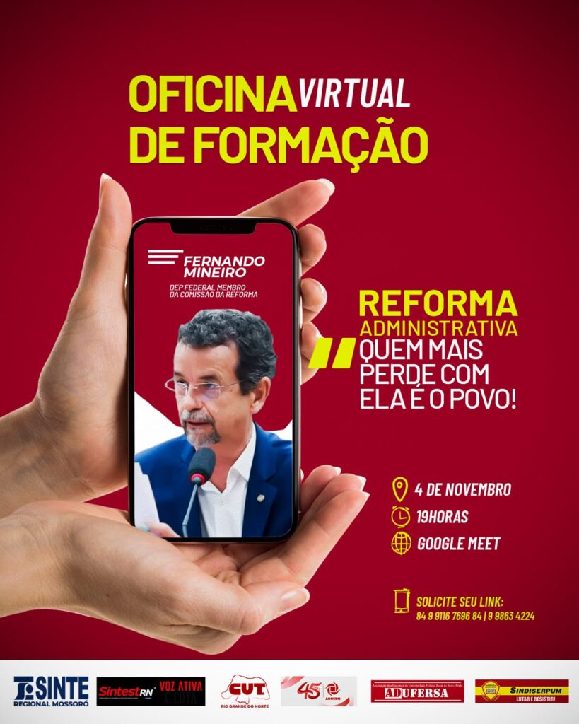 Nesta terça-feira (4), às 19h, acontece a Oficina de Formação Virtual: “Reforma Administrativa; quem mais perde com ela é o povo”, uma iniciativa das entidades sindicais do Oeste potiguar para debater e compreender os impactos dessa proposta que ameaça o serviço público em todo o Brasil. O momento formativo será conduzido pelo deputado federal Fernando […]