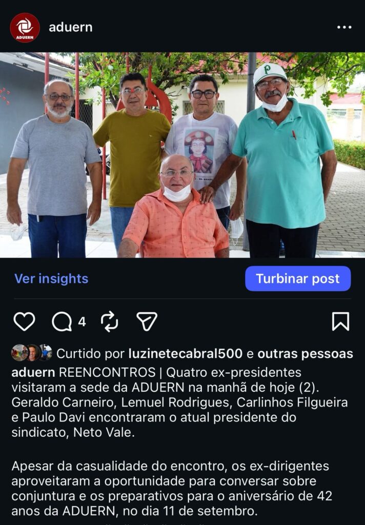 Em uma de suas últimas visitas à sede da ADUERN, no final de 2022, Carlinhos relembrou histórias ao lado de outros quatro ex-presidentes do sindicato: Paulo Davi, Lemuel Rodrigues, Geraldo Carneiro e Neto Vale. O momento emblemático foi registrado e publicado nas redes sociais da entidade.